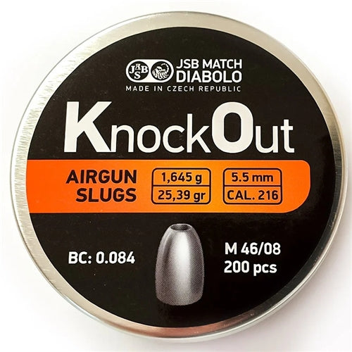 JSB KNOCK OUT AIRGUN SLUGS 5.5MM 200 PER TIN CAL .216 - 25.39 GRAIN (No returns)